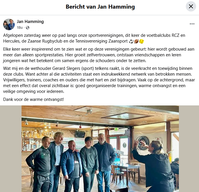 Afgelopen zaterdag weer op pad langs onze sportverenigingen, dit keer de voetbalclubs RCZ en Hercules, de Zaanse Rugbyclub en de Tennisvereniging Zaansport ![]()